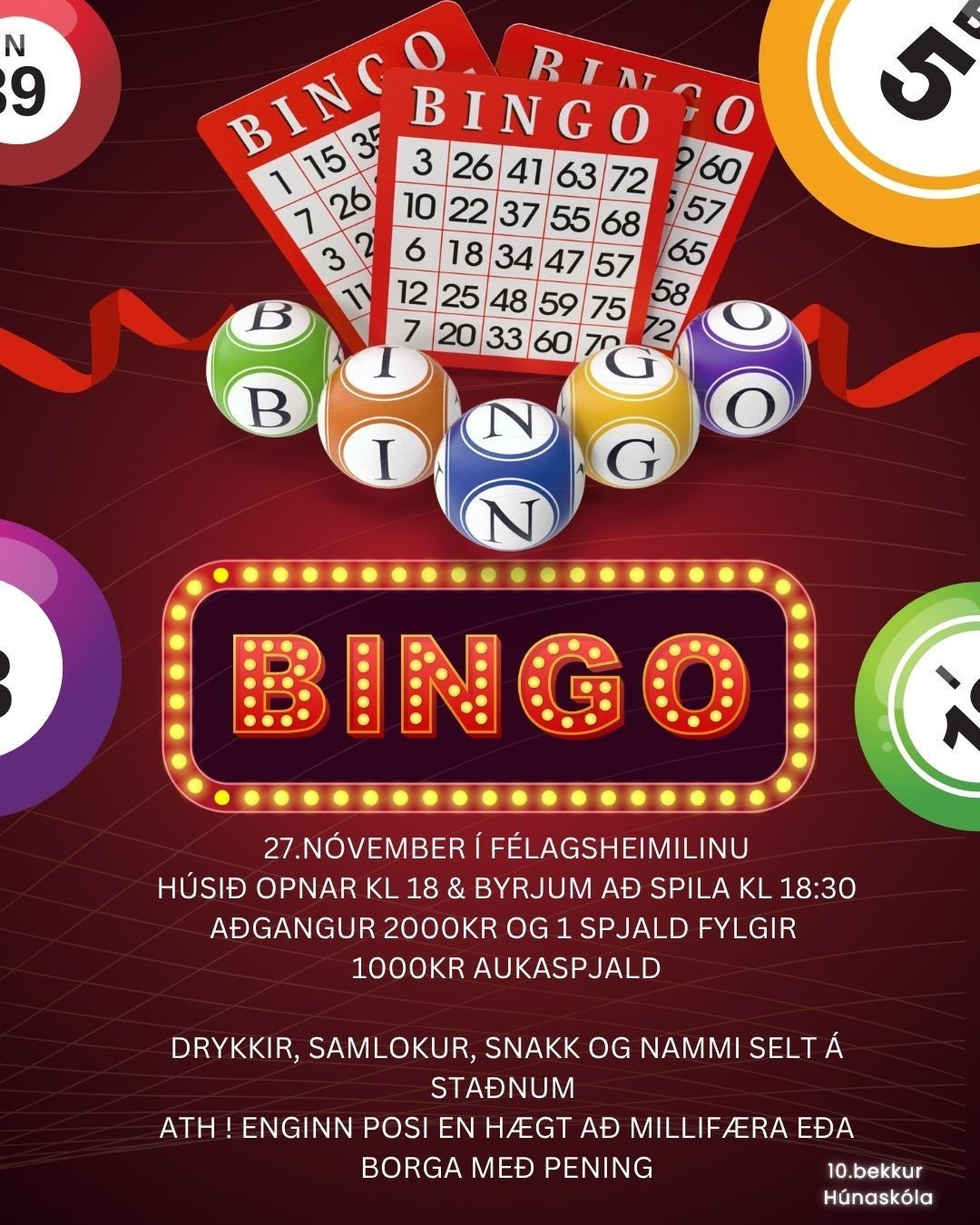 Næstkomandi fimmtudag, þann 27. nóvember kl.18:30, heldur 10. bekkur Húnaskóla bingó í Félagsheimilinu á Blönduósi. Húsið opnar kl.18:00. Veglegir vinningar í boði, bæði í bingóinu og svo verður einnig happdrætti og fleira skemmtilegt.