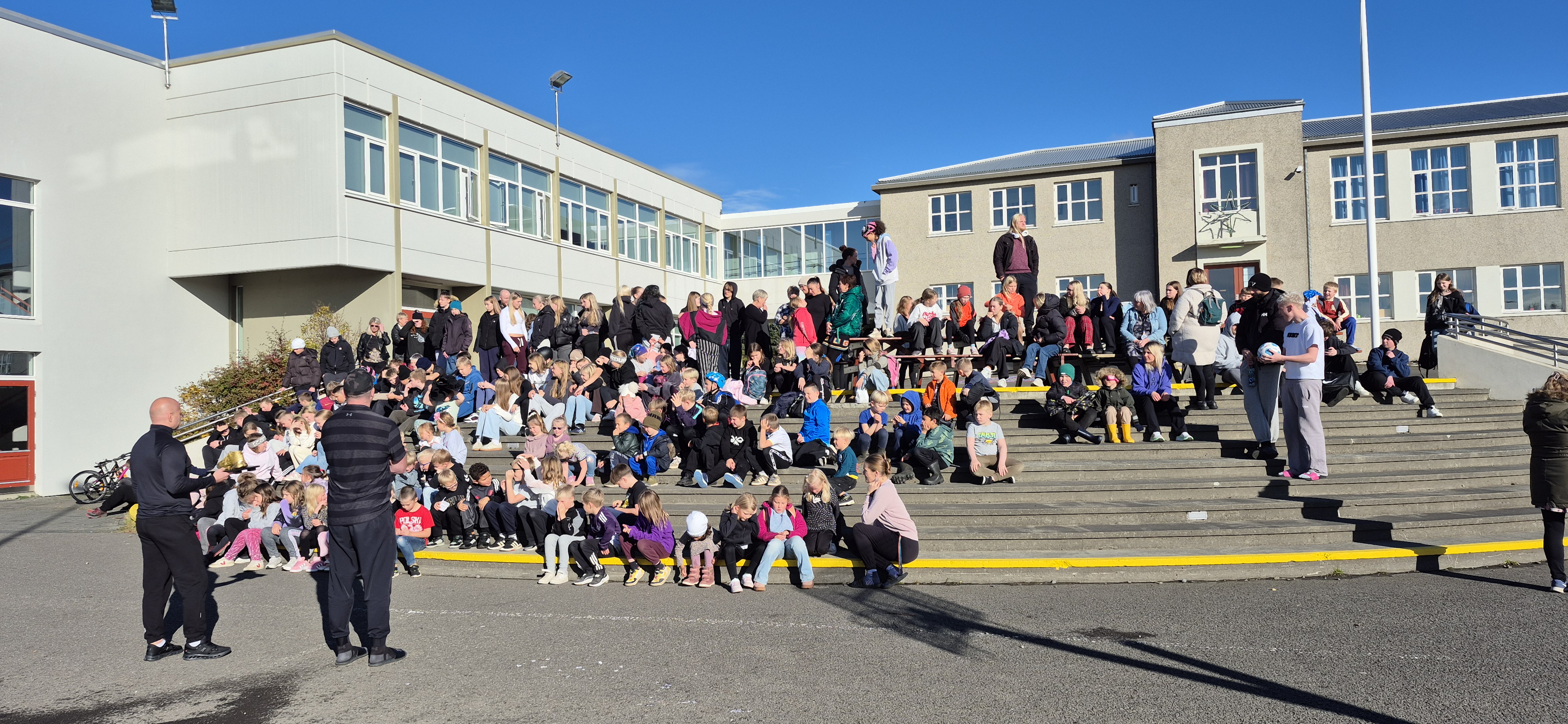 Íþróttakennararnir Óli og Karol afhentu Gullskóinn við mikil fagnaðarlæti. Skórinn verður í umsjá sigurbekkjanna til skiptis yfir skólaárið og verður góð áminning um mikilvægi þess að hreyfa sig og velja umhverfisvænan ferðamáta.